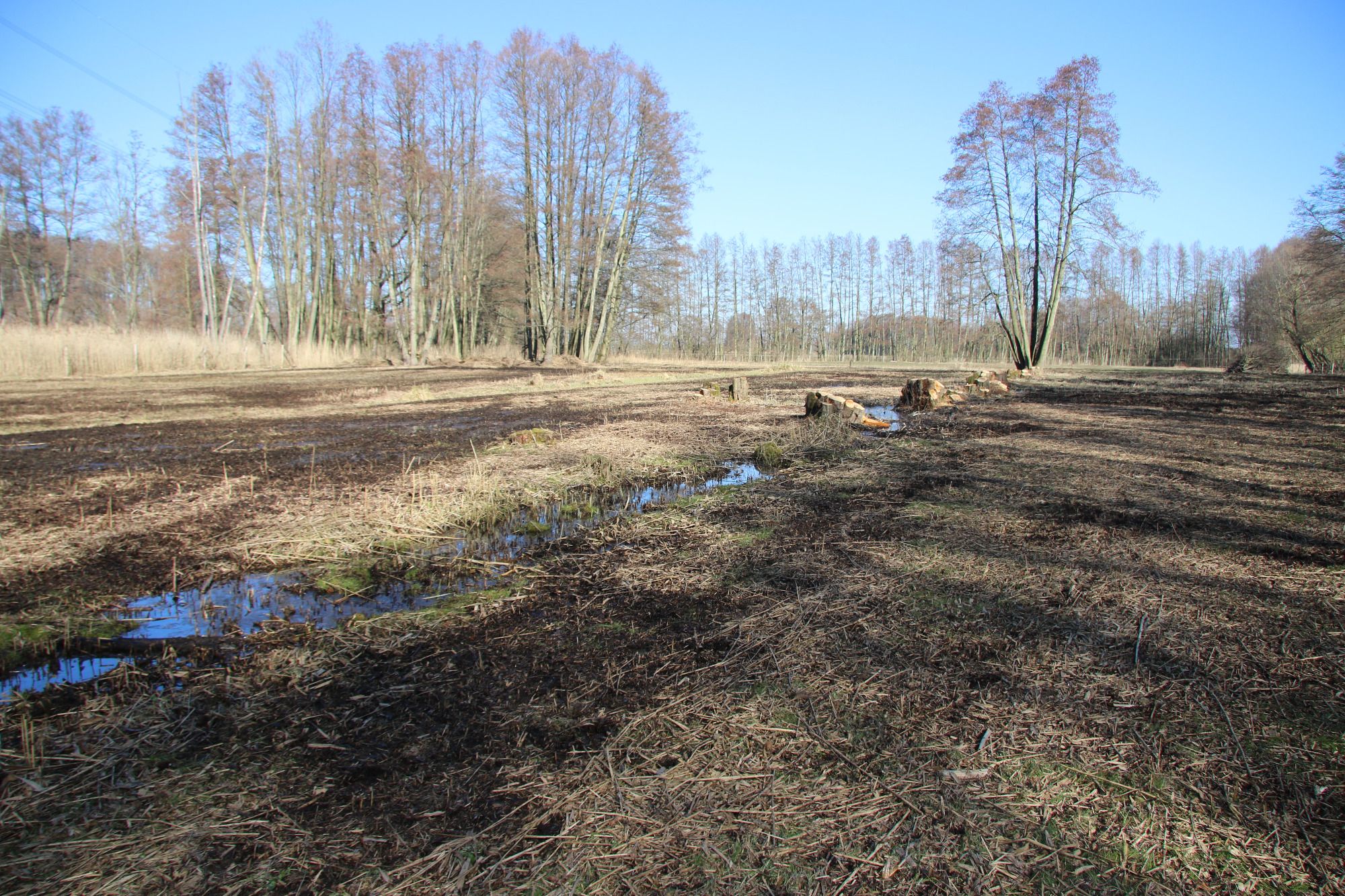 Verbesserung der Wasserhaltung durch weitere Kleinstaue, Wiesenfreistellung, Mahd, Abtransport und Verteilung Mähgut